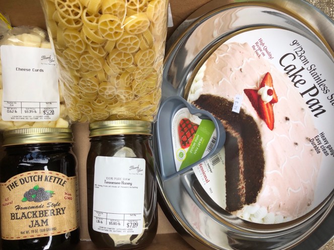 Finally we made our way to the Country Pantry. The things that bring joy to these girls are small. Cheese curds, wagon wheel pasta and cake pans for Anna Claire, and blackberry jam and a small heart-shaped cake pan for Madeline. Local honey for me. ๐ And, as always, they love pushing the child-sized shopping carts ๐ there.