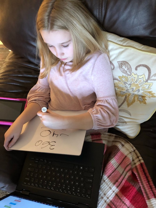 We found out schools would be closed for one week, then we would have spring break. We wondered if we would go back to school after spring break, so we continued with school work: writing assignments, projects, ixl and checking Google Classroom. So many educational sites offered free access which has been wonderful. We had a homeschool experience. My girls took to homeschooling right away. They wanted time to read books, write, and do some online work, but loved the freedom to pursue their own interests, have choices, and to be able to move and talk throughout the day. We did math on white boards, and made a leprechaun trap for St. Patrick’s Day.