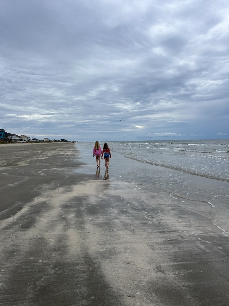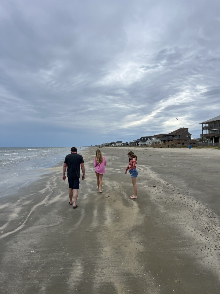 Once everyone was fed, we were ready to enjoy some beach time. I talked the group into checking out Jamaica Beach. It is a much less crowded area. We were the only ones there with the exception of a few fisherman. It was also a drive-on beach. It feels so foreign to drive and park your car on the sand, just feet away from the crashing waves. Speaking of crashing waves, there was a front coming in with rain in the forecast the next day, so no one wanted to get in and swim here. The current was way too rough. I would recommend this beach to others because it isn’t crowded, and I was able to find quite a few pretty shells. The girls enjoyed running along the beach and writing their names in the sand. The sand is pretty packed due to it being driving on.