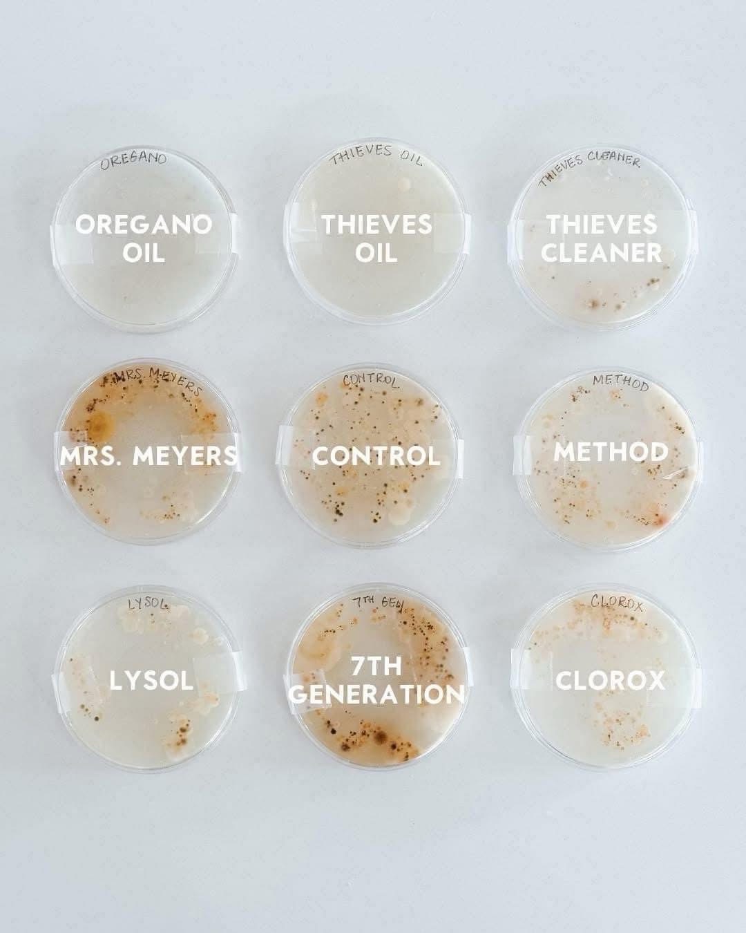 Thieves products are plant based, all natural and potent! A picture is worth a thousand words. Just look at the image below to see how Thieves responds to bacteria vs its chemical laden counterparts. And of course Thieves oil is a key ingredient in Thieves Cleaner so it smells amazing!