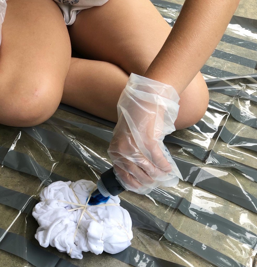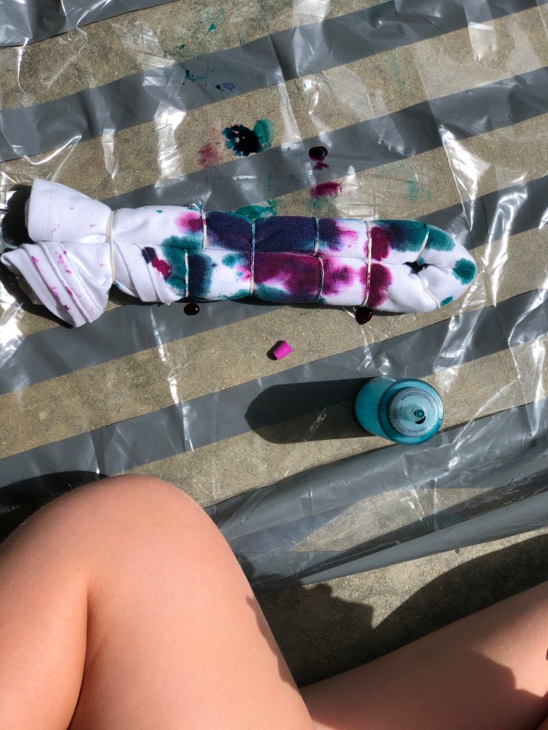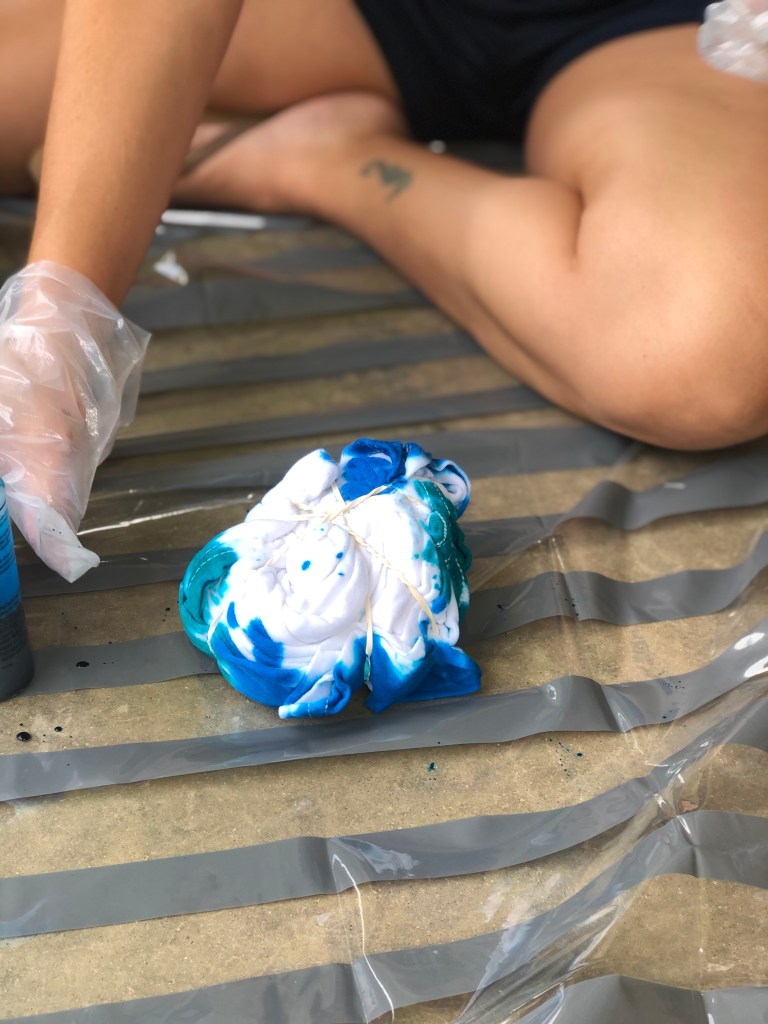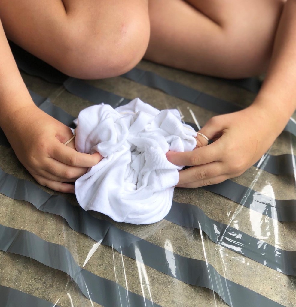 2. Use a shower curtain or tarp. As you can see in the above pic we used a shower curtain to place under us. We also worked outside. I’ll be honest, tie-dying is messy. The more systems you have in place to prevent messes the more fun you’ll have!